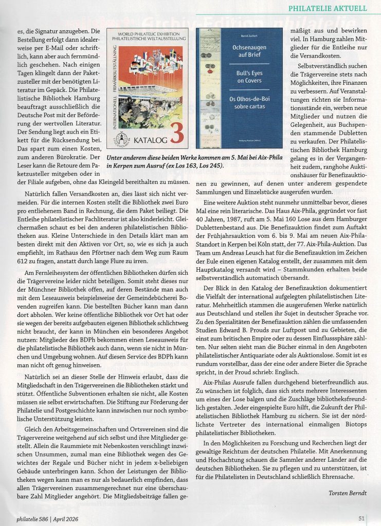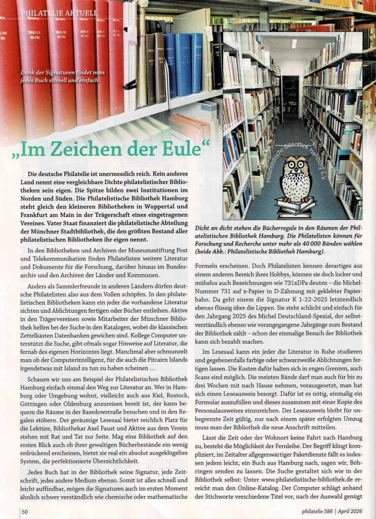 Der Autor Torsten Berndt hat sich in dem Artikel „Im Zeichen der Eule“, erschienen in der philatelie 586, April 2026, Seiten 50 und 51, mit den Philatelistischen Bibliotheken und der geplanten Benefizauktion beschäftigt. Sollten Sie diesen Artikel versäumt haben, finden Sie ihn hier zum nachlesen: